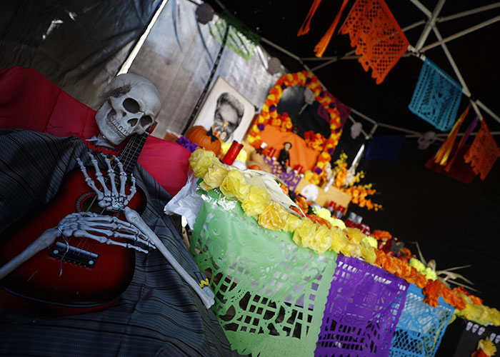 Como en cualquier altar del día de muertos, no falta el arco que según la tradición permite pasar del mundo de los muertos al de los vivos donde si quisieran volver, tanto Mario Moreno –Cantinflas– como Chavela encontrarían pan de muertos, frutas, flores, calabazas e incluso calaveras de azúcar.
