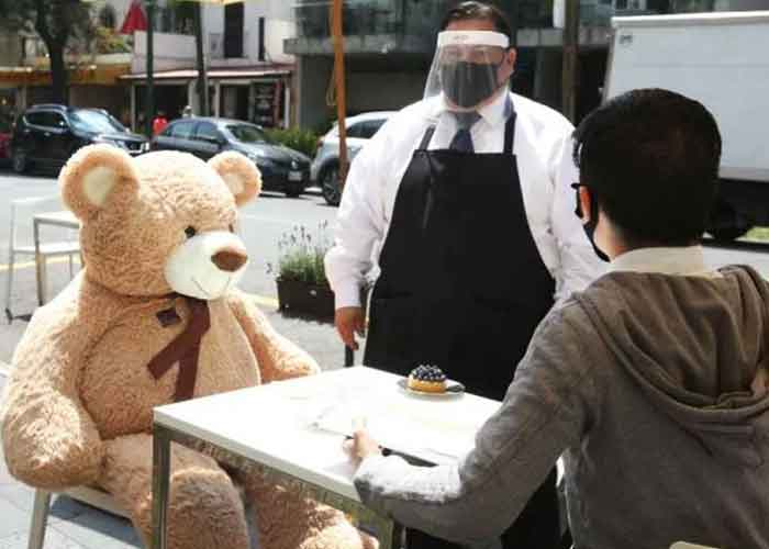 La cafetería Jaso Bakery, ubicada en el centro de la Ciudad de México, quiere que la sana distancia sea mucho más divertida y es por eso que ha implementado usar tiernos y gigantes osos de peluche en las mesas para que los comensales respeten el distanciamiento social requerido para evitar contagios durante la actual pandemia de COVID-19.
