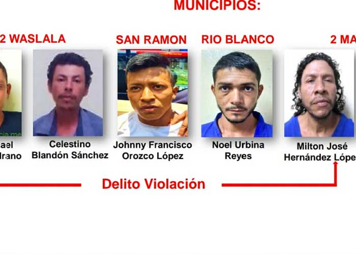 También fueron detenidos: Juan Ismael García Medrano, Celestino Blandón Sánchez, Johnny Francisco Orozco López, Noel Urbina Reyes, Milton José Hernández López; todos estos por el delito de violación.