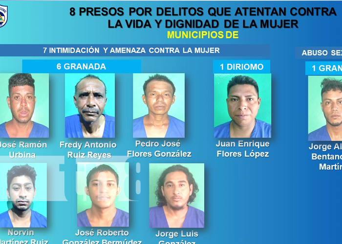 Por intimidación y amenazas contra la mujer, responden ante la justicia, los granadinos: José Ramón Urbina, Freddy Antonio Ruiz Reyes, Pedro José Flores González, Norvin Martínez Ruiz, José Roberto González Bermúdez, Jorge Luis González y el diriomeño Juan Enrique Flores López.