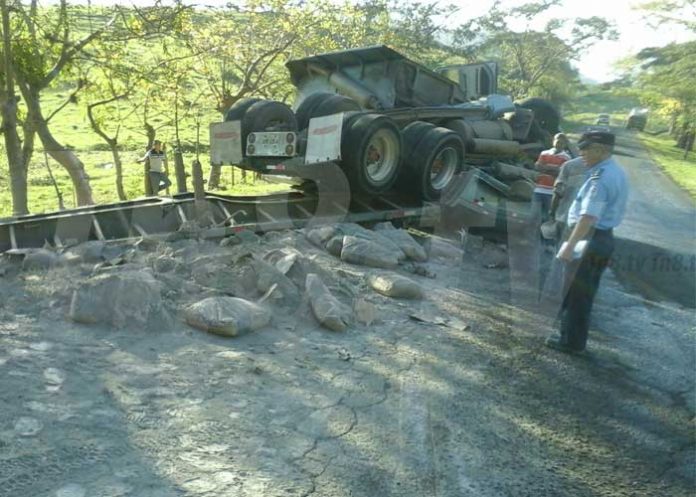 Un camión que transportaba cemento se volcó en el tramo carretero Muy Muy-Matiguás, en la zona de Matagalpa. El accidente dejó un lesionado, daños materiales y causó embotellamiento por varios minutos.