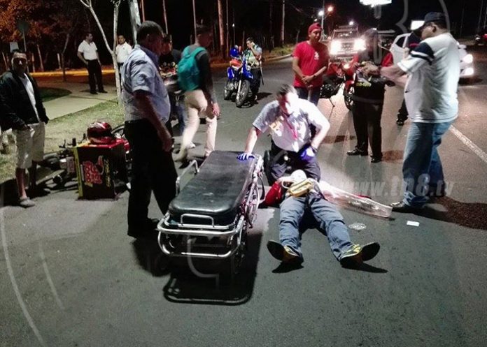 A emergencias del Hospital Militar fue trasladado en una ambulancia de Cruz Roja nicaragüense, el repartidor de comidas rápidas, Roger Quintero de 37 años, al resultar con trauma de tórax, fractura en la clavícula y el brazo izquierdo después de estrellarse con su moto contra la parte trasera de un taxi, de los semáforos del Club Terraza, dos cuadras arriba.