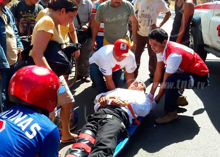 Con fractura en el tobillo derecho y golpes en el cuerpo quedó Wilbert Antonio Altamirano de 43 años conductor de una motocicleta color rojo placa LE 6531, producto del impacto Gloria Pérez Ruíz de 38 años quien iba como acompañante resultó con excoriaciones en las piernas y rodillas, el accidente ocurrió en la carretera que va a los repartos sureste de la ciudad de León.