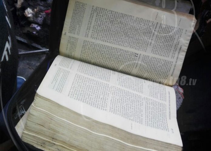 La casa de doña Marlene del Socorro Sequeira quedó reducida a polvo y cenizas después que un voraz incendio la consumiera la tarde de este jueves, sin embargo algo que quedó completamente intacto fue una Biblia, la cual ha sido encontrada entre los restos.