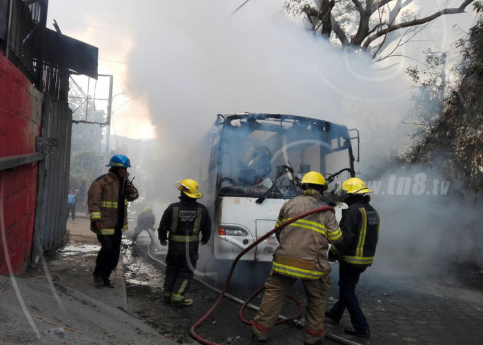 Esta tarde de lunes un autobús que cubre la Ruta MR4 de Managua, tomó fuego y quedó con serios daños en su carrocería, por lo que llegaron equipos de bomberos de Nicaragua para poder controlar la situación.