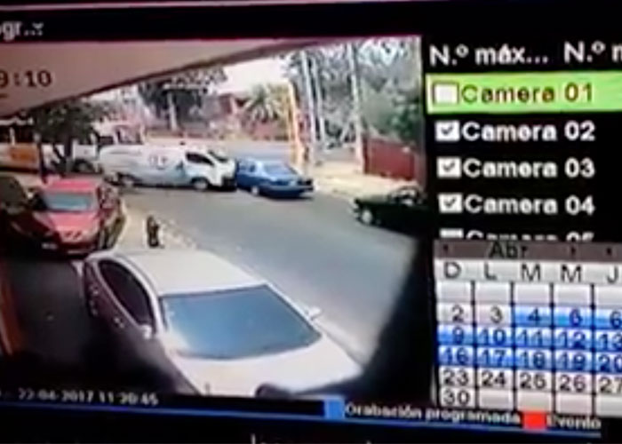 En el video se observa que los involucrados son un autobús y un microbús y el que sale perdiendo en todo este accidente es un vehículo azul que está esperando detrás de una moto el cambio de luz en el semáforo ubicado por el motel el Dorado en Managua.
