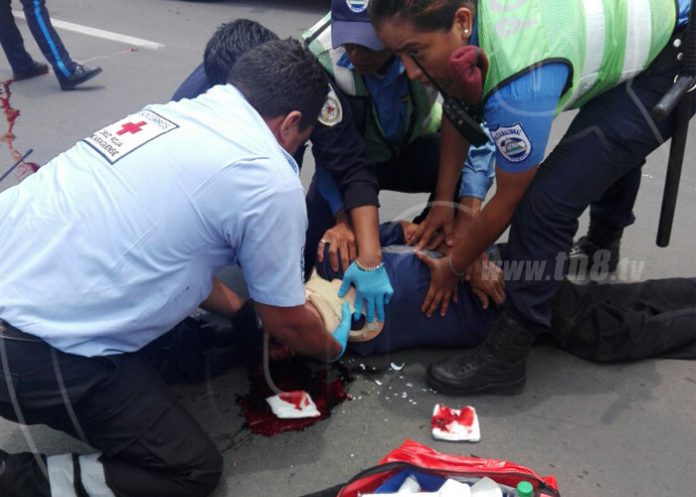 Miembros de Cruz Roja Nicaragüense y de la Dirección General de Bomberos hacían todo lo posible para salvarle la vida al ciudadano, quien aparentemente presentaba un trauma craneocefálico y además derramó gran cantidad de sangre.