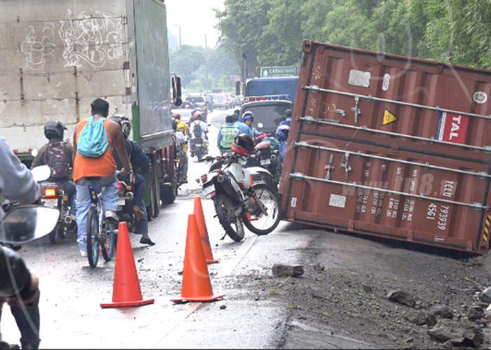 El conductor de un cabezal salió afortunadamente ileso de un accidente de tránsito en la madrugada de este viernes, cuando un contenedor que llevaba en su camión se le desprendiera y terminara volcado a orillas del kilómetro 7.5 de la Carretera Vieja a León, en Nicaragua.