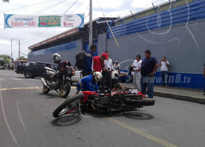 En las inmediaciones de la escuela María Mazzarello, en el barrio Altagracia de Managua, ocurrió esta mañana de martes un accidente de tránsito en el que resultó lesionado el motociclista Vladimir Orozco, de 27 años aproximadamente.