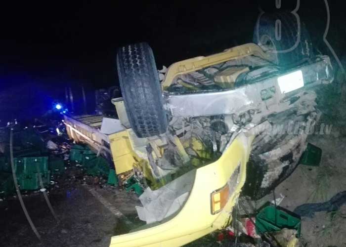 En el kilómetro 93 de la carretera que va de Puertas Viejas, Ciudad Darío hacia el municipio de Esquipulas, en el departamento de Matagalpa, se registró un aparatoso accidente de tránsito cuando un camión que trasportaba cervezas y bebidas energizantes chocó con un paredón de tierra y se dio vuelta, dejando una persona fallecida de nombre Jorge Arauz de 22 años y al conductor de nombre German José Zúniga con lesiones de gravedad.
