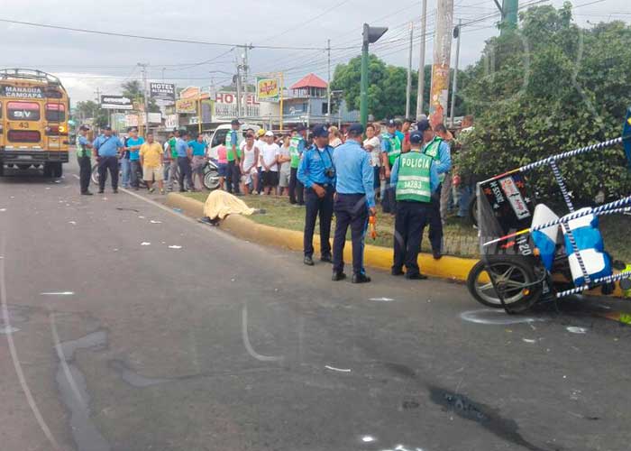 Camino al distrito el conductor de la mototaxi viajaba a exceso de velocidad, y en los semáforos realizó el giro sin percatarse que el bus iba en su preferencia, lo cual resultó ser mortal, impactando la parte frontal del bus con costado de la caponera, quedando volcada y falleciendo inmediatamente el conductor de esta, asimismo, los pasajeros que viajaban en ella resultaron son múltiples lesiones siendo trasladado el oficial al Hospital Carlos Roberto Huembes y el ciudadano de la diversidad sexual al Hospital Alemàn Nicaragüense.