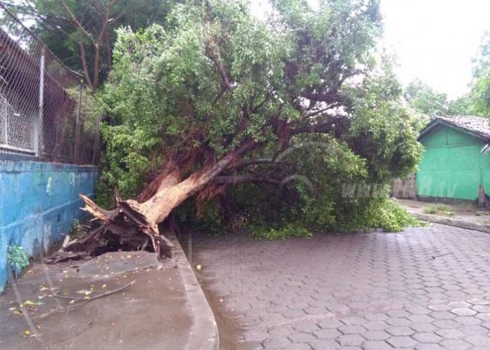 Una fuerte lluvia acompañada de tormenta eléctrica causó este martes la caída de un frondoso árbol de laurel de la India en la escuela pública de primaria Madre Virginia Rosero, el acontecimiento se repitió en la Escuela El Rosario; además una vivienda en el barrio Julio César Tinoco resultó afectada por el fenómeno natural y dos viviendas del sector norte de la ciudad de Chinandega colapsaron.