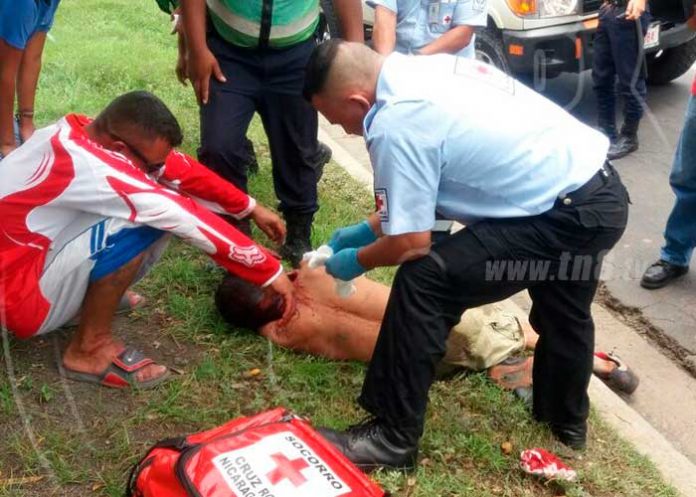 Una unidad de la Cruz Roja Nicaragüense llegó al lugar para que técnicos en emergencias médicas le prestara la atención prehospitalaria y contener la abundante emanación de sangre que por el alcohol en la sangre era una tarea difícil.