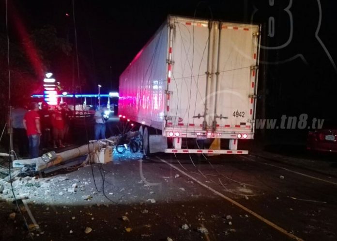 El poste había quedado sostenido por las conexiones, pero el conductor imprudente de un cabezal pasó por el sector donde el tráfico estaba complicado y con el contenedor destruyó parte del cableado que sostenía al poste, provocando que cayera sobre el contenedor y luego al suelo, originando hasta "chispas" mientras caía.