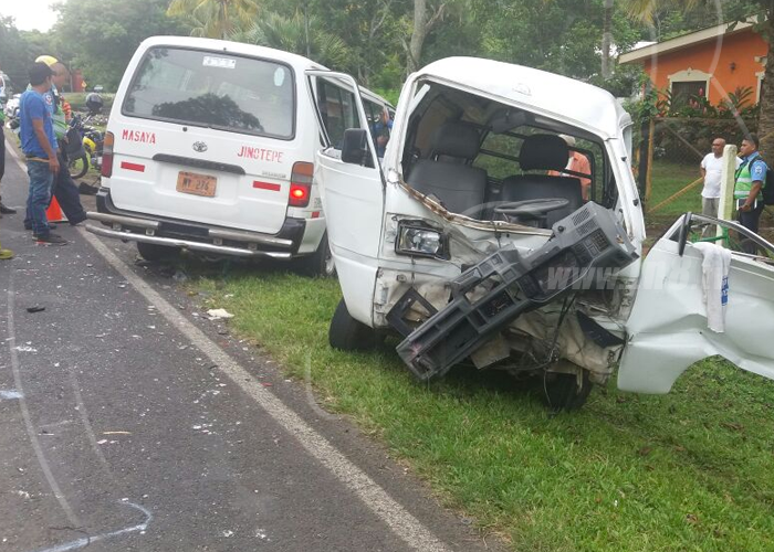 Cuatro pasajeros de un interlocal que cubre la ruta Jinotepe- Masaya resultaron con fracturas graves luego de que el medio de transporte sufriera un fuerte choque frontal contra un microbús repartidor, provocado por la invasión de carril, en la carretera Jinotepe- San Marcos.