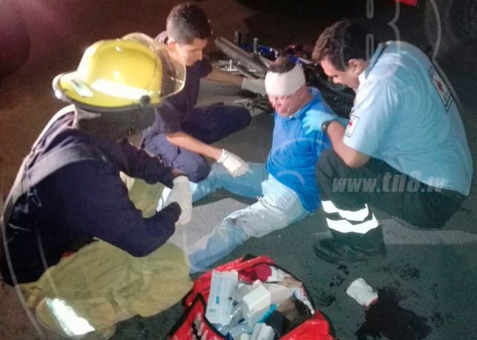 Con una herida frontal, trauma en el tabique nasal y golpes en diversas partes del cuerpo resulto el peatón Gustavo Antonio Cortez, de 40 años de edad, al ser atropellado por una motocicleta color azul, placa 144-010, conducida por don Fernando Hernández Valle de 52 años.