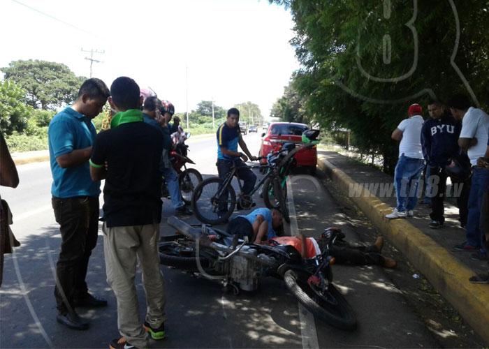 Un motociclista y su acompañante resultaron lesionados al impactar contra el costado derecho de una camioneta en el kilómetro 23 de la Carretera Tipitapa a Masaya. Aparentemente el motociclista realizó una mala maniobra e intentó aventajar por el lado derecho.