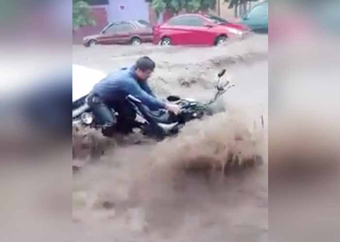 El fuerte aguacero causó desastres en varios puntos de la capital y arrastró por completo una motocicleta en la que se transportaba un joven.