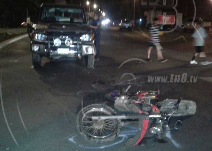 Tres miembros de una familia que viajaban a bordo de una motocicleta color rojo, placa M 111350, resultaron lesionados luego de ser atropellados por una camioneta color gris, placa MT 25256, que era conducida por Diego Enrique González, de 76 años de edad, en el empalme Tipitapa- Masaya.
