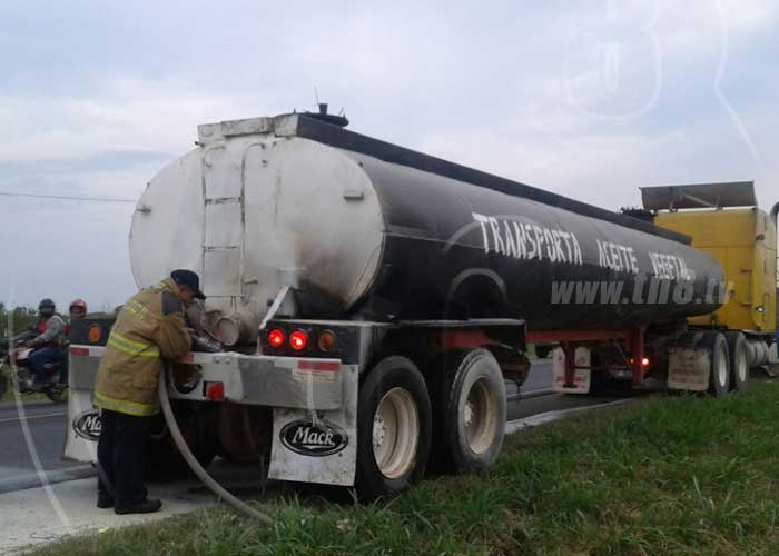 El conductor de una rastra que transportaba aceite vegetal se llevó tremendo susto cuando una de las llantas traseras del pesado vehículo color blanco, placa M 096 445, tomara fuego mientras iba en marcha sobre el kilómetro 27 de la carretera Panamericana Norte, en Tipitapa.