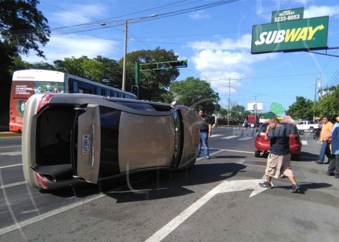 Por poco y Carlos Espinoza convierte su rutinario viaje al trabajo en una verdadera tragedia, ya que se quedó dormido al volante y terminó completamente volcado justamente en los semáforos de La Rocargo, Distrito VI de Managua.