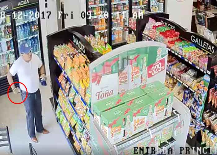 Algunas personas buscan objetos de valor y mercadería en un centro de ventas o tiendas, pero esta vez el sujeto de la filmación decidió ocupar una técnica de "la antigua escuela" para robarse tres cervezas de una gasolinera cercana a la Rotonda La Virgen en Managua.