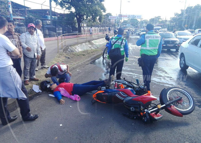 Debido a las aguas negras que se encuentran emanando de un manjol ubicado de Enel Central, 1 cuadra y media abajo, en Managua, la mañana de este viernes se registró un accidente de tránsito por que dicha agua ha dejado la calle resbalosa, provocando que un motociclista perdiera el control y que otro que venía acompañado también cayera al pavimento.