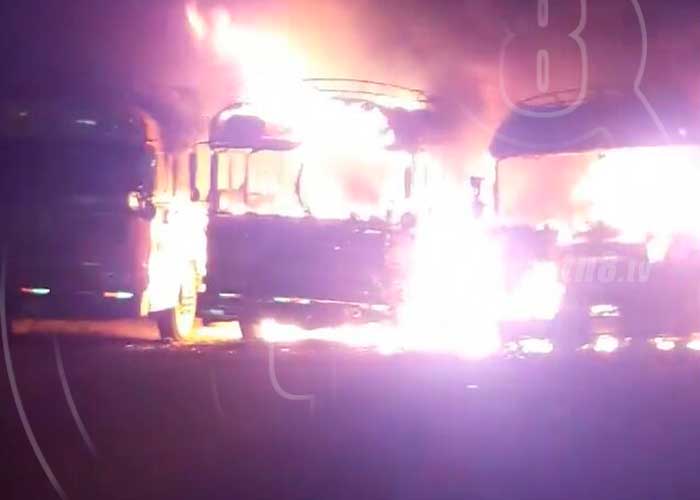 Dos buses de la ruta Masaya hacía Managua propiedad del transporte cuadra se estaban quemando de manera repentina en el parqueo que se ubicada del monumento la Reforma una cuadra al sur, uno quedó completamente calcinado mientras el otro parcial, las lenguas de fuego eran amenazantes tanto como para propietarios así como para vecinos que trataron de ayudar a sofocar las llamas que de manera rápida consumían ambos transportes colectivos.
