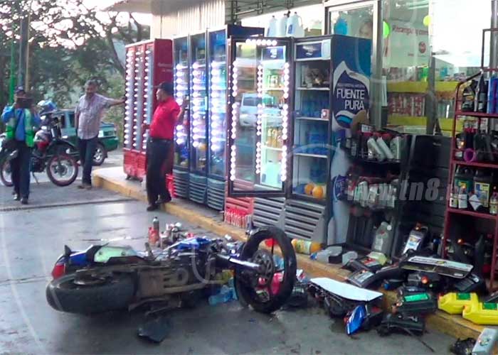 Por realizar un giro indebido por poco le cuesta la vida a William José Jarquin Gonzales de 27 años de edad, quien por fortuna solo resulto con excoriaciones en partes de su cuerpo al colisionar con los productos de venta de una de las gasolinera del Municipio de Boaco.