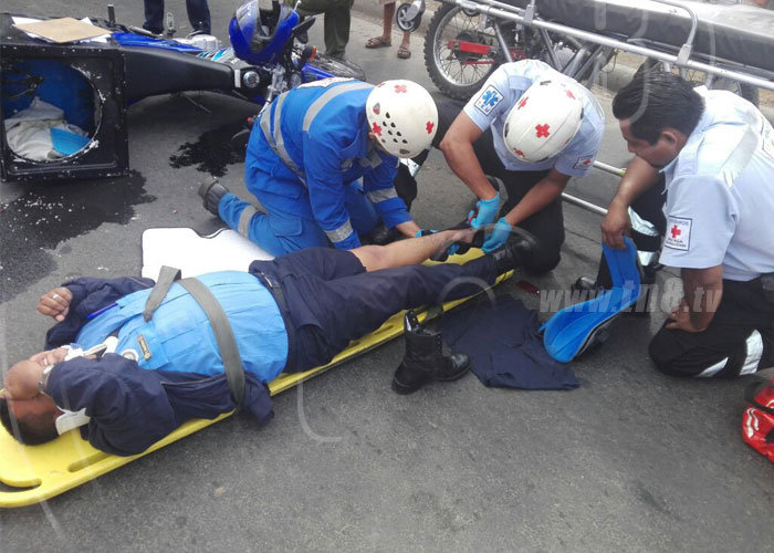 El oficial de la Policía Nacional Yasmani Antonio Martínez de 21 años, resultó con posible fractura en su pierna izquierda más golpes en diversas partes del cuerpo al estrellarse este martes con su motocicleta contra un vehículo, exactamente de los semáforos del barrio Jonathan González, media cuadra al sur, en Managua.