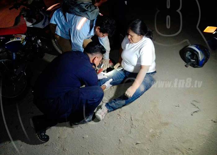 “Ella presenta un trauma en la rótula derecha, más golpes en diversas partes del cuerpo. El que conducía la motocicleta presenta golpe en el maxilar inferior, golpes y excoriaciones en el rostro, mientras que el cuerpo del primer motociclista al que vinimos a asistir que ya tenemos en la ambulancia lleva un trauma de tórax, trauma en la rodilla y en diversas partes del cuerpo. Los vamos a trasladar al hospitalito de aquí de ciudad Sandino”, manifestó Mario Rivas, paramédico de la DGB.