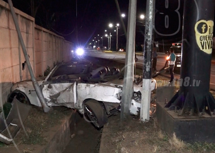 Según testigos, el carro circulaba de Managua a Masaya a exceso de velocidad y al llegar a la rotonda ubicada frente al Zoológico Nacional, el conductor quien supuestamente conducía bajo los efectos del licor, perdió el control del volante estrellándose violentamente contra un rotulo publicitario, saliendo en el aire y pegando contra un poste del tendido telefónico hasta terminar su marcha impactado contra las losetas de una bodega de una entidad bancaria.