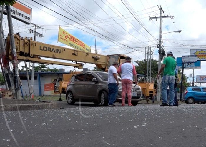 Un accidente de tránsito se registró la tarde de este sábado frente a la Óptica Nicaragüense en Bolonia, al momento que Jony Alexander Fuentes quien conducía un bus de la ruta 102 y viajaba con dirección de este a oeste impactara contra una grúa que era conducida por Larry Antonio Cerda, quien viajaba con dirección de norte a sur y tenia una señal de alto.