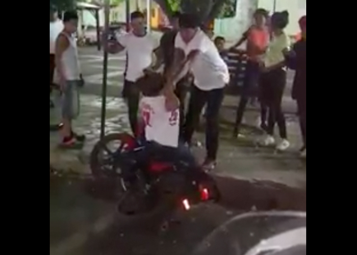 Todo empezó cuando ésta se le acercó a uno de los tipos (quien parece es cercano a ella) para reclamarle por haber interrumpido sus actividades de ocio. En el video se aprecia que la pelea ya tenía un buen rato de haber comenzado, de pronto la mujer se acerca a la moto del sujeto en cuestión y la pateó, logrando así que cayera.