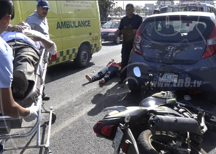 Guillermo Antonio Reyes era el ciudadano de 56 años de edad quien conducía su motocicleta de abajo hacia arriba aventajando e invadiendo el carril contrario este en compañía de Reyna Lissette Fonseca de 54 años, esta última resultó con una posible fractura en uno de sus pies al impactar la mota a un costado del taxi y luego en la parte trasera de otro vehículo cuyo conductor espera tener oportunidad para seguir su marcha normal.