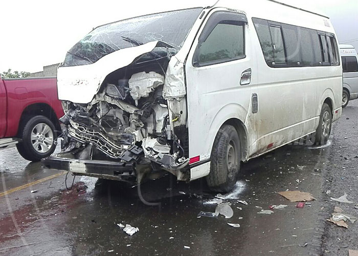 Erick Ramírez de 42 años y Anibal Núñez, conductor de la camioneta que trabaja para una empresa de telefonía celular, resultaron lesionados, al igual que algunos pasajeros que viajaban en un microbús interlocal que cubre la ruta Jinotepe-Managua. El accidente de tránsito ocurrió en el kilómetro 31, Carretera Sur.