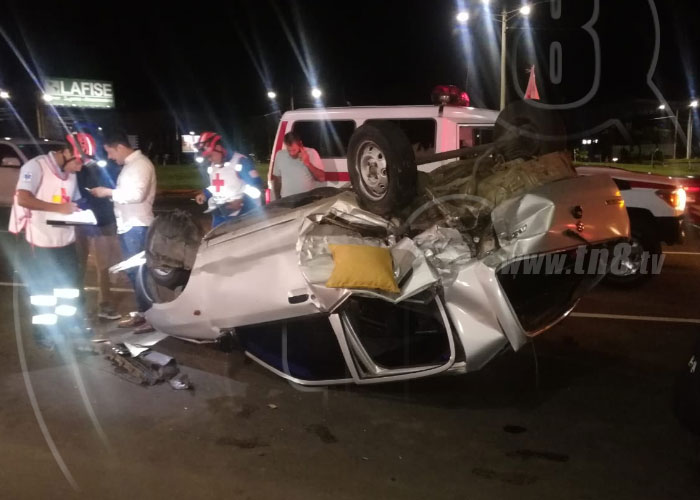 #ÚLTIMAHORA #Nicaragua ??|? Vehículo? termina volcado en la rotonda Jean Paul Genie #Managua, luego de que otro vehículo lo impactara por la parte trasera. A pesar de que el conductor quedó atrapado dentro del vehículo, logró salir sin lesión alguna.