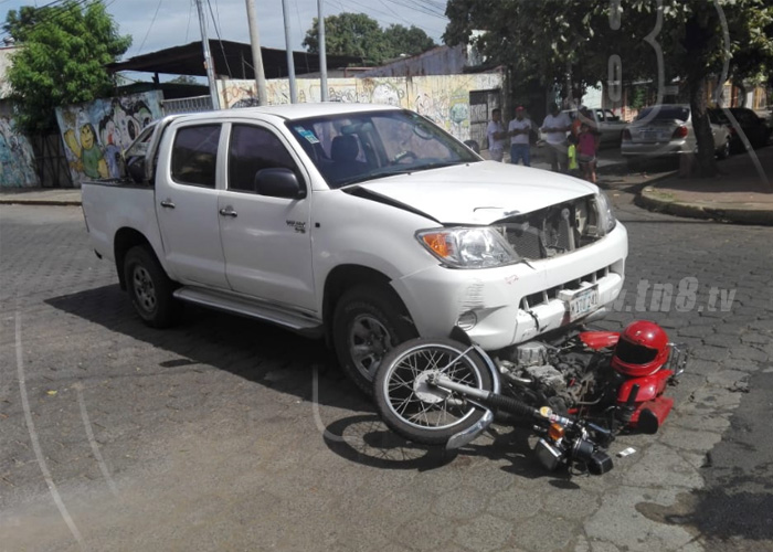 La imprudencia del conductor de un camión repartidor de productos varios por pasarse la señal de Alto, provocó este viernes por la mañana la aparatosa colisión entre un motociclista y una camioneta en las cercanías al Colegio Divino Pastor, barrio Altagracia, en Managua.