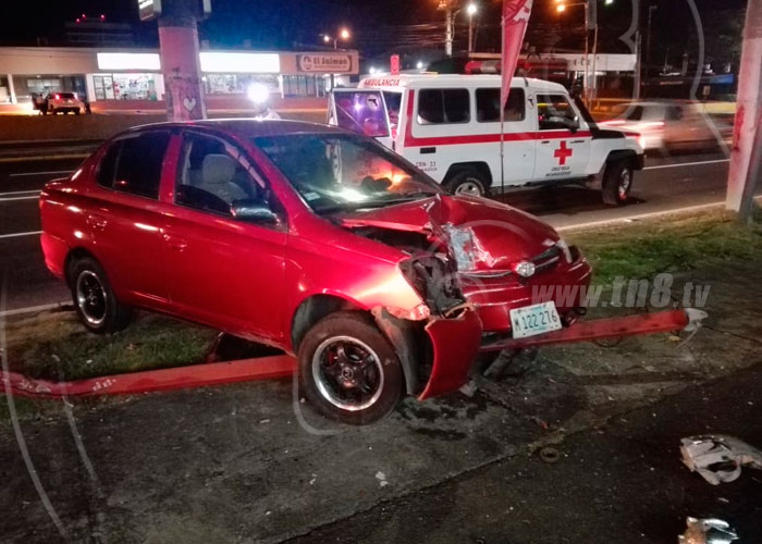 De la rotonda Centroamérica, una cuadra al sur, en carretera Masaya, el colombiano Fernando Martínez Villareal, de 46 años de edad, se estrelló con su vehículo contra un poste metálico, resultando con una herida de consideración en la región frontal al impactar contra el vidrio.