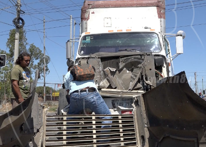 Un fuerte accidente de tránsito entre un camión y un bus se registró cerca de los Nuevos Juzgados de Managua la mañana de este miércoles. El impacto dejó como saldo cuantiosos daños materiales y resultó lesionada una señora.