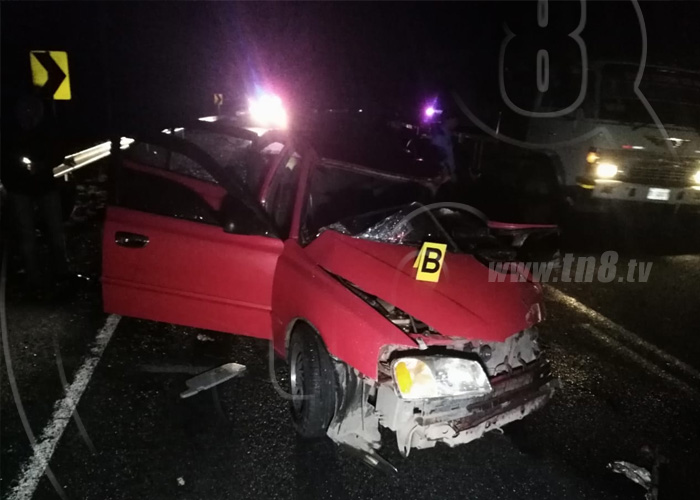 La noche de este domingo en el kilómetro 56 de la carretera hacia el departamento de Matagalpa se registró un fuerte accidente de tránsito entre una camioneta, color gris placas LE 219 46, contra un carro color rojo placas GR 12733. Como consecuencia del fuerte impacto dos personas murieron de forma inmediata y otras dos resultaron con heridas de gravedad en diferentes partes del cuerpo.