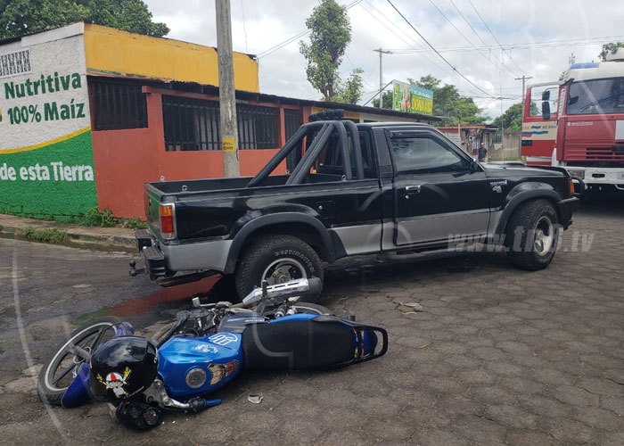 Un fuerte accidente de tránsito se registró la mañana de este viernes en el Reparto Schick, en Managua, al momento que Eduardo José Rodríguez de 48 años, conductor de una camioneta, realizara una mala maniobra y provocara que Levy Torres de 21 años, quien conducía una motocicleta, se estrellara a un costado.