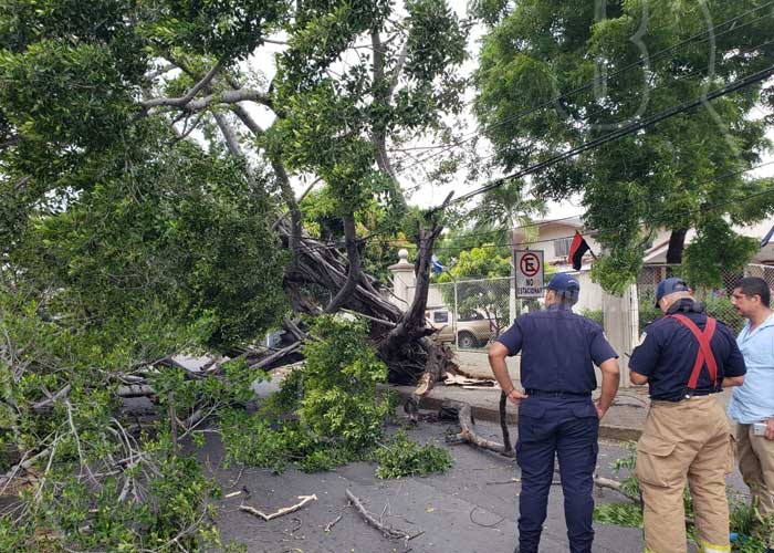 Trabajadores de la Alcaldía de Managua colaboraron para agilizar el trabajo de los bomberos y luego fueron los encargados de limpiar la calle y trasladar la madera para que no obstruyera el paso.