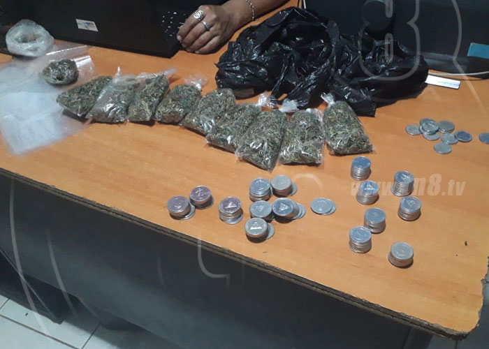 Durante el allanamiento se realizó la incautación de un saco pequeño macen, el cual contenía hierba color verde y 10 bolsitas posicleras, las cuales también contenían hierba color verde, una guitarra electrónica color blanca, 82 monedas de 5 córdobas y 90 monedas de 1 córdoba; para una suma total de 500 córdobas en efectivo.