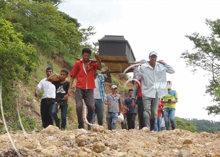 Estas personas tuvieron que caminar aproximadamente más de 10 kilómetros por un camino de difícil acceso, cargaban un ataúd donde se encontraba el cuerpo sin vida de Roger Dávila Castillo de 53 años de edad, quien fue asesinado supuestamente por un familiar.