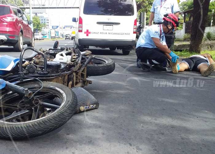 Tendido en el pavimento, frente al Colegio Teresiano, en la Carretera a Masaya, quedó este lunes el motociclista Norlan José Hernández López, quien se trasladaba en su moto Pulsar color azul, placa MY 6859, al momento de ser impactado por un vehículo Nissan Sentra color gris.