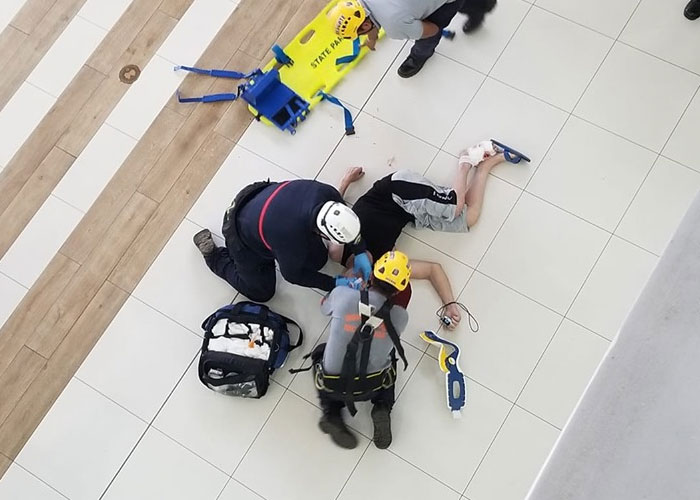 Bomberos Unificados y Policía Nacional realizaron atención prehospitalaria a persona del sexo masculino, que cayó desde el segundo piso del edificio (área de cafetín) de unos 7.5 metros de altura. Al lugar se movilizó 1 ambulancia, 1 patrulla policial y 6 fuerzas.