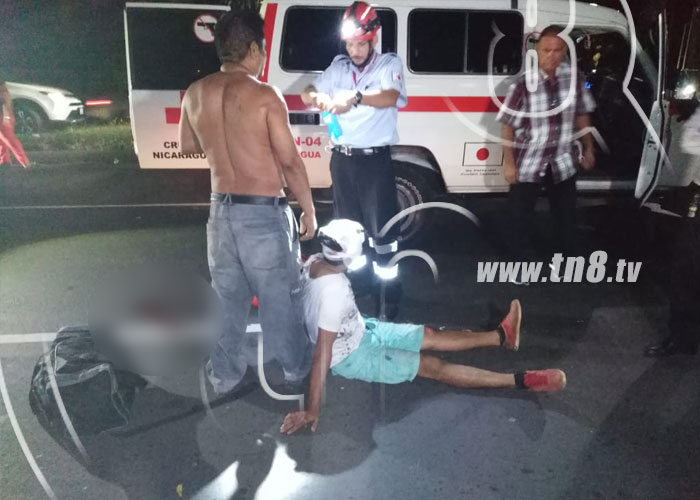 El hecho se dio en el km 13 carretera a Masaya y la magnitud del accidente provocó que el bomper del carro quedara incrustado en la motocicleta. A bordo de la moto placa, M 24 792 viajaban Santos Yurinda, conductor de la motocicleta y su yerno Kevin Pascua. Hasta el momento se desconoce el nombre de la mujer quien conducía el vehículo color gris, marca Toyota, placa M 292 309.