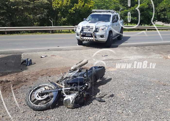 El joven Elder Adán Barrera Espinoza originario de Juigalpa, resultó con una posible fractura en una de sus piernas luego de que el conductor de una camioneta de nombre Edgar López realizó un giro a la izquierda, impactando el motociclista en un costado de la parte delantera del vehículo, saliendo por los aires, quedando a un lado de la vía con graves lesiones.