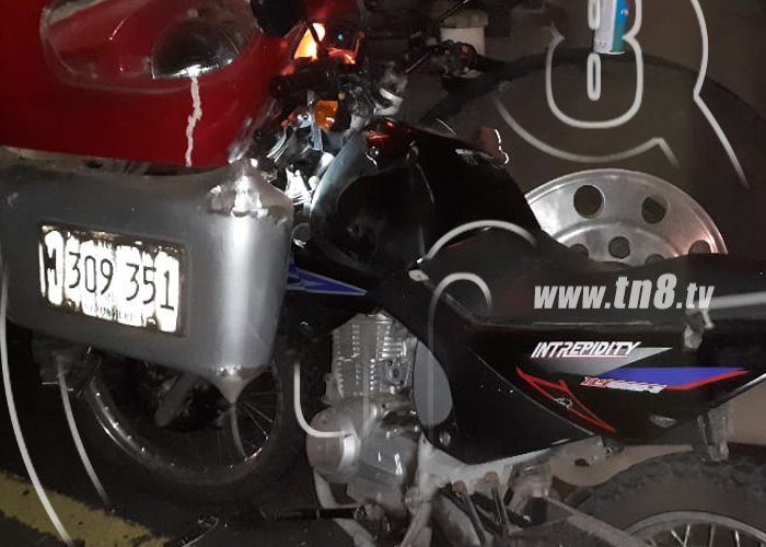 El hecho ocurrió cuando el conductor del camión color rojo con blanco y negro, placa M 309 355 y conducido por el señor Samuel de Jesús Leiva González de 35 años, estaba intentando ingresar a un garaje frente a Restaurante Reynaldo, cuando derrepente los ciudadanos Orlando Jirón originario de la Concordia y Luz Marina Mairena de San Rafael quiénes viajaban de sur a Norte a bordo de una motocicleta colo negra marca Dayun placa M 126 442, impactaron con el camión.